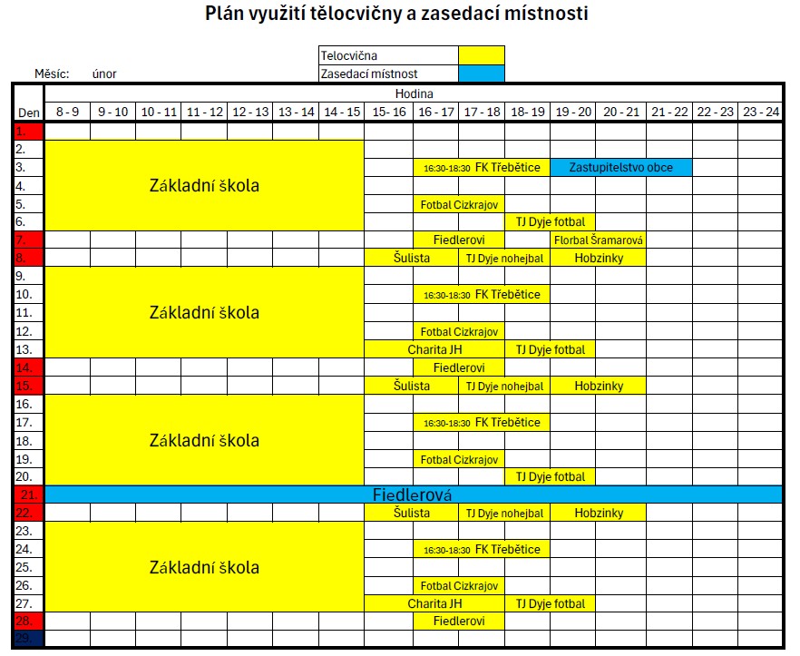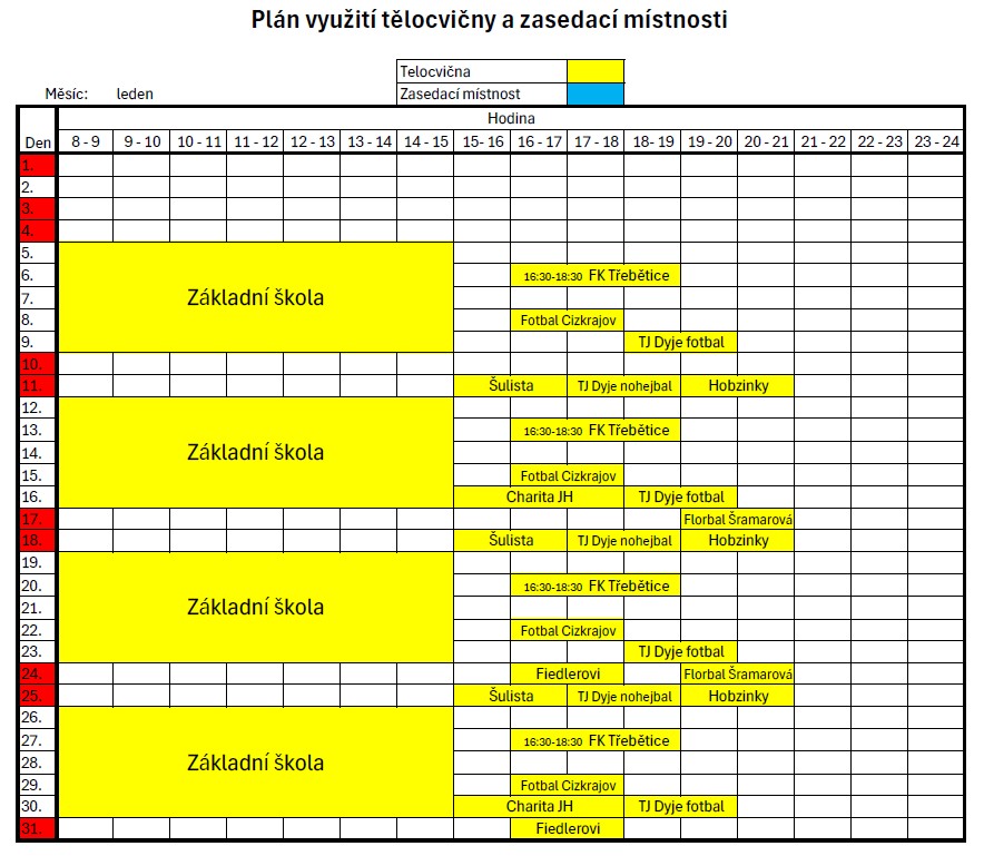 Rozpis obsazení tělocvičny v měsíci leden a únor 2026.